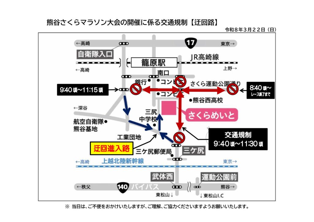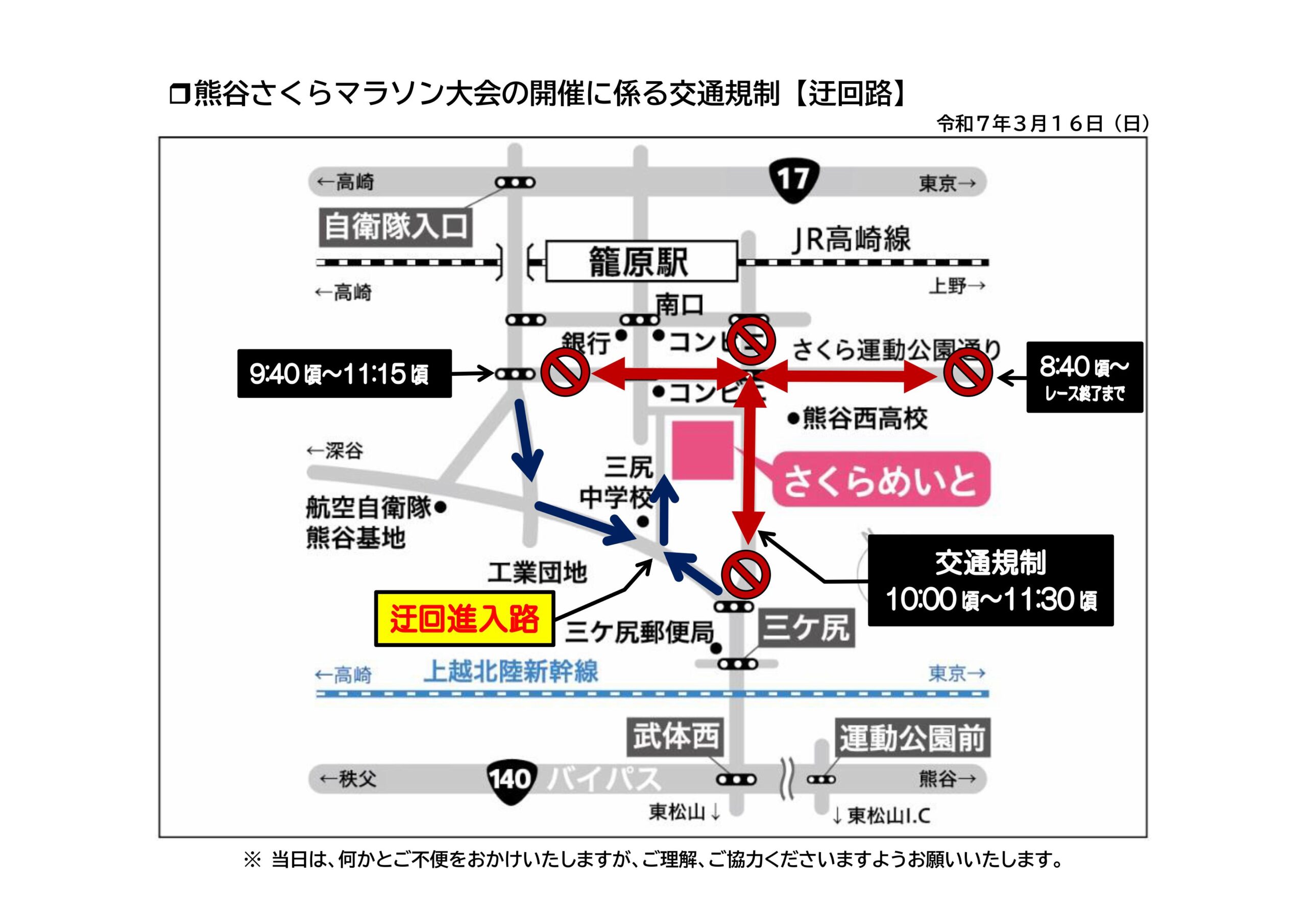 第36回熊谷さくらマラソン大会に伴う交通規制のお知らせ【3月22日(日)さくらめいと出入口周辺の交通規制】